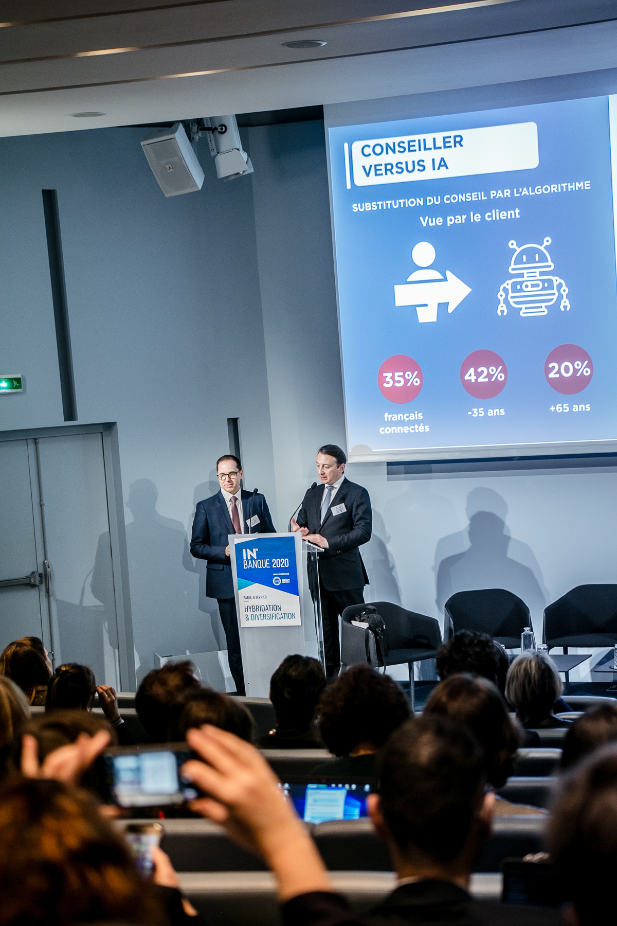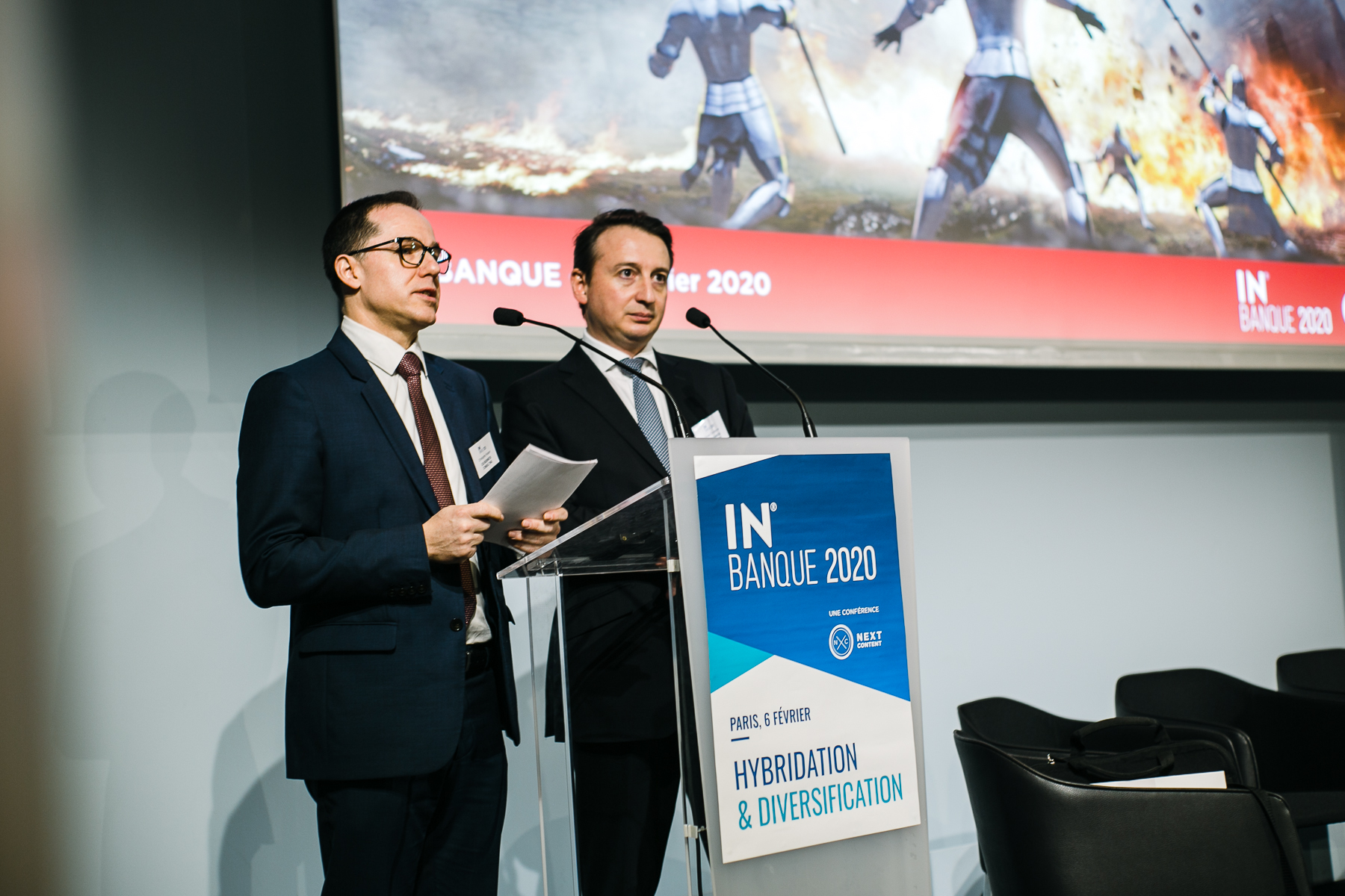 - Erwan Cabillic (Crédit Mutuel Arkea) à droite, et derrière, Nathalie Mourlon (Crédit Agricole d’Ile-de-France) – IN BANQUE 2020 – Crédit photo : Guillermo Gomez